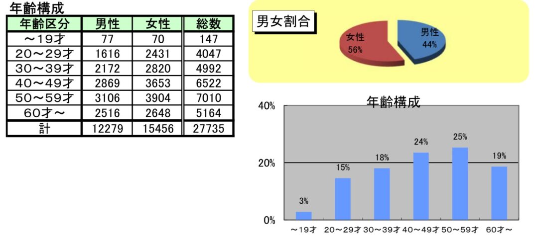 男女比の割合は、男性が 44%、女性が 56%であり、やや女性の方に多くご利用いただいております。