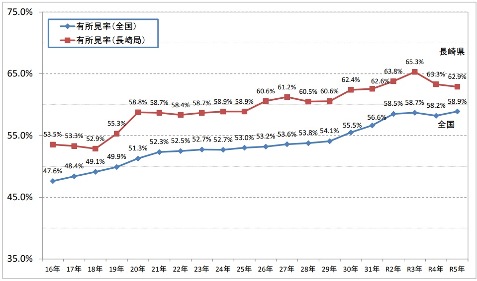 定期健康診断における有所見率は年々増加し、長崎県は平成26年以降 6 割を超えています。全国と比較した際の、高齢化による影響もその 1 つと考えられます。