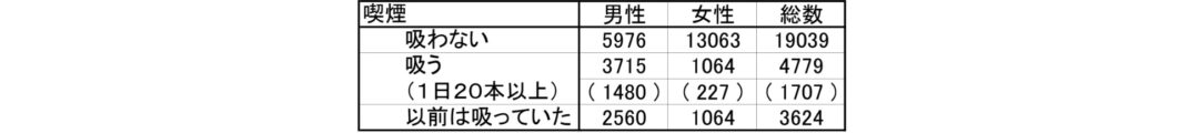 当健診センター健診者(2024年度受診)において、「現在、習慣的にたばこを吸っていますか?」という質問に対し、男性の喫煙率は約30%、女性は約7%でした。(下表参照)
