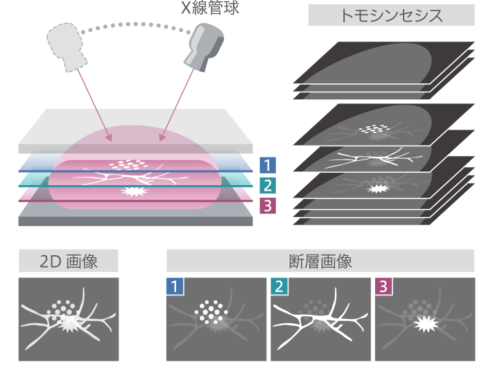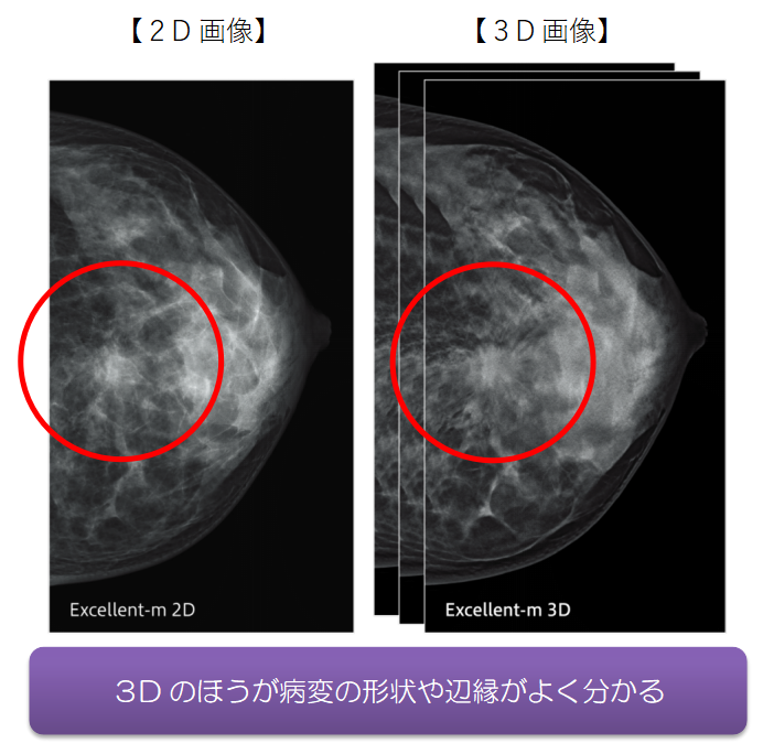 従来の2Dマンモグラフィでは乳房を平面で撮影するため、高濃度乳房では病変が乳腺と重なって見えにくいことがありましたが、3Dマンモグラフィでは乳房を立体的に撮影できるため、従来のマンモグラフィ検査では見つけにくかった病変も、より明確に診断ができます。