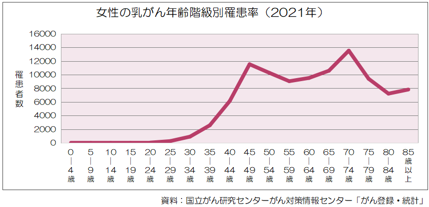 昨今、日本でも乳がんにかかる女性が急増しており、国立がん研究センターの統計によると、30〜64歳の女性では乳がんががんによる死亡原因の上位を占めています。日本人女性では、一生のうち、およそ 9人に1人 が乳がんにかかると言われています。発症は発症は20歳代からみられ、30歳代で増加し、40歳代後半と60歳代後半にピークがあります。そのため、20歳を過ぎたら“乳がん年齢”ともいえます。